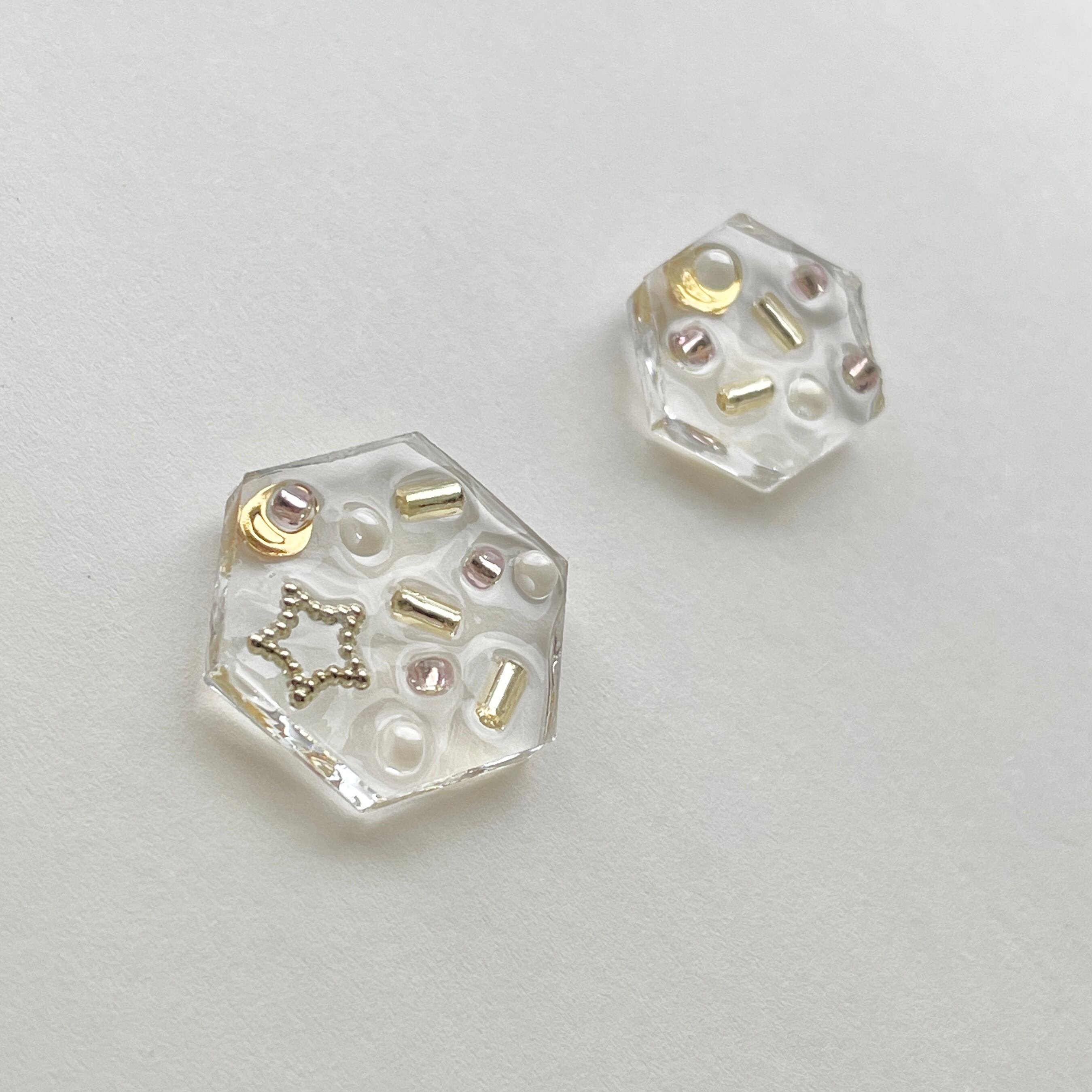 ビーズを星に見立てた夜空みたいなデザインのクリアピアス。